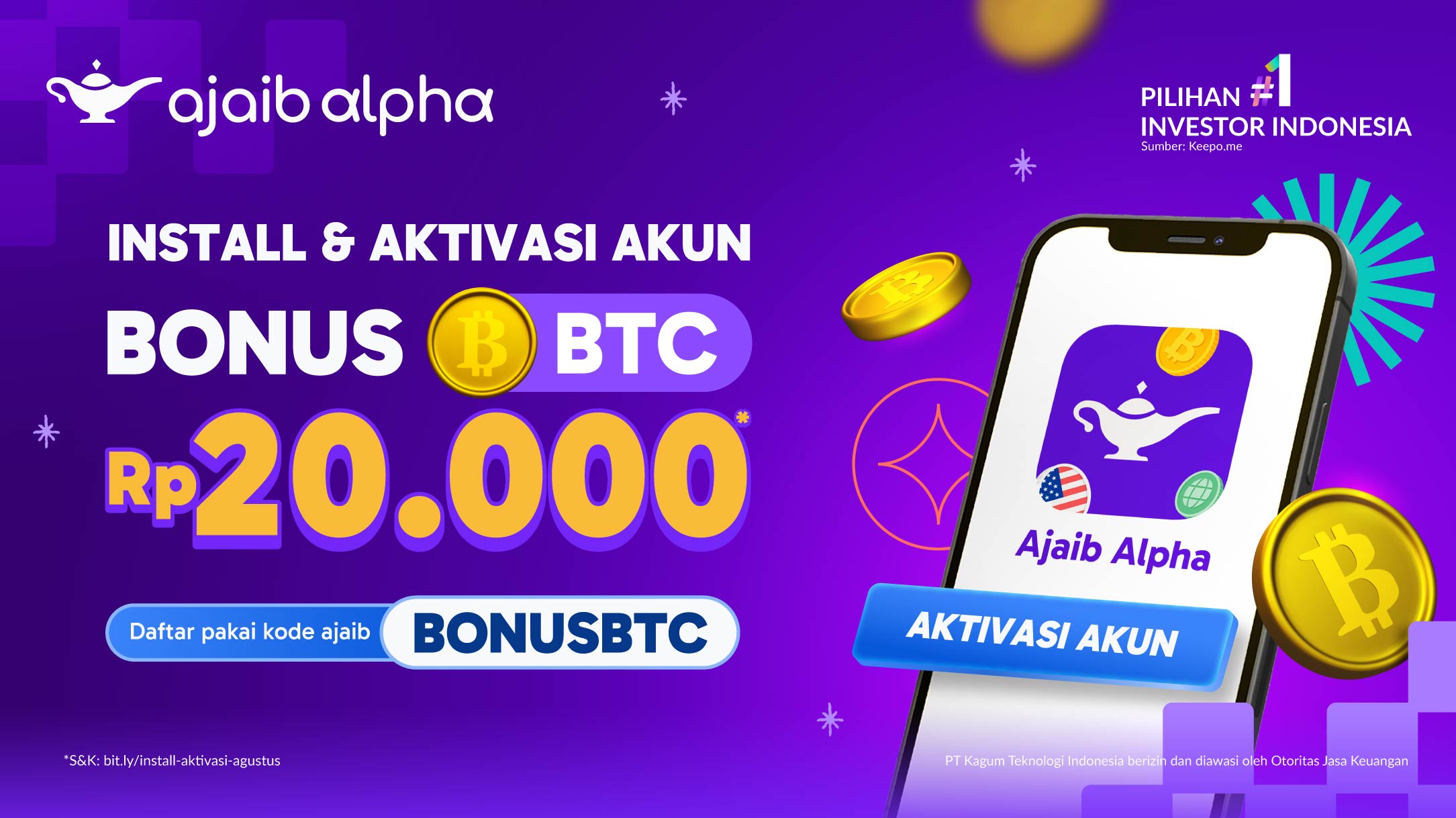 - Pelanggan berkesempatan mendapatkan hadiah Aset Kripto BTC senilai Rp20.000 (dua puluh ribu Rupiah) dengan melakukan aktivasi akun Ajaib Alpha pakai Kode Ajaib BONUSBTC.
