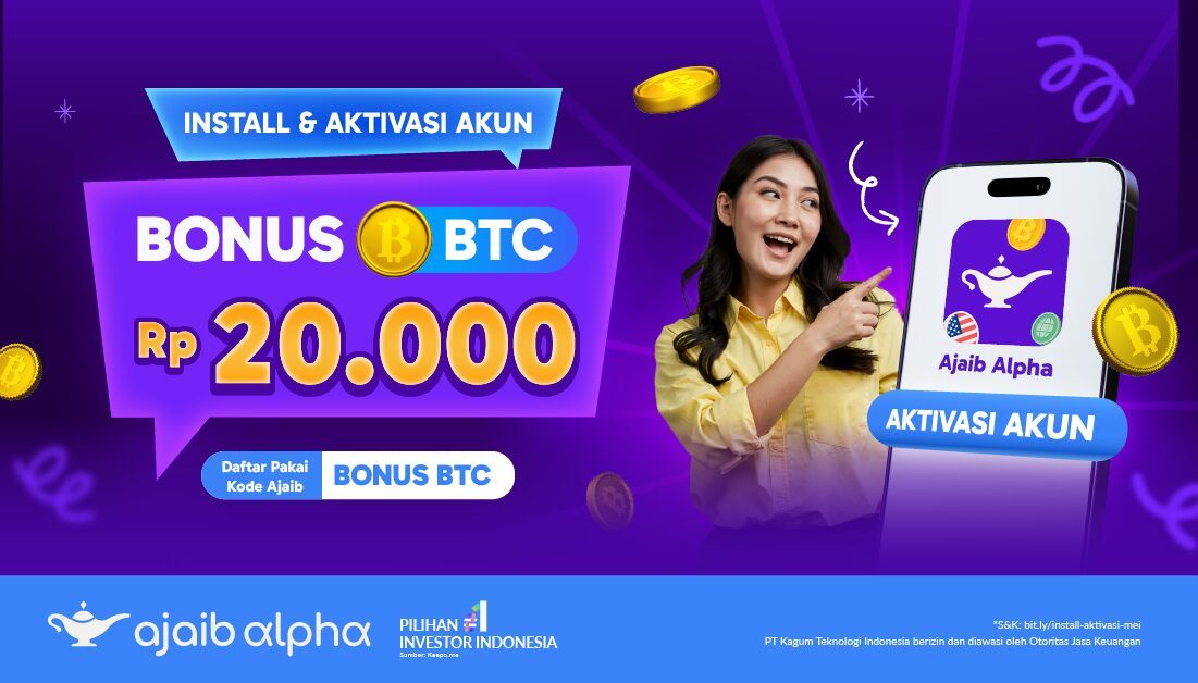 - Pelanggan berkesempatan mendapatkan hadiah Aset Kripto BTC senilai Rp20.000 (dua puluh ribu Rupiah) dengan melakukan aktivasi akun Ajaib Alpha pakai Kode Ajaib BONUSBTC.
